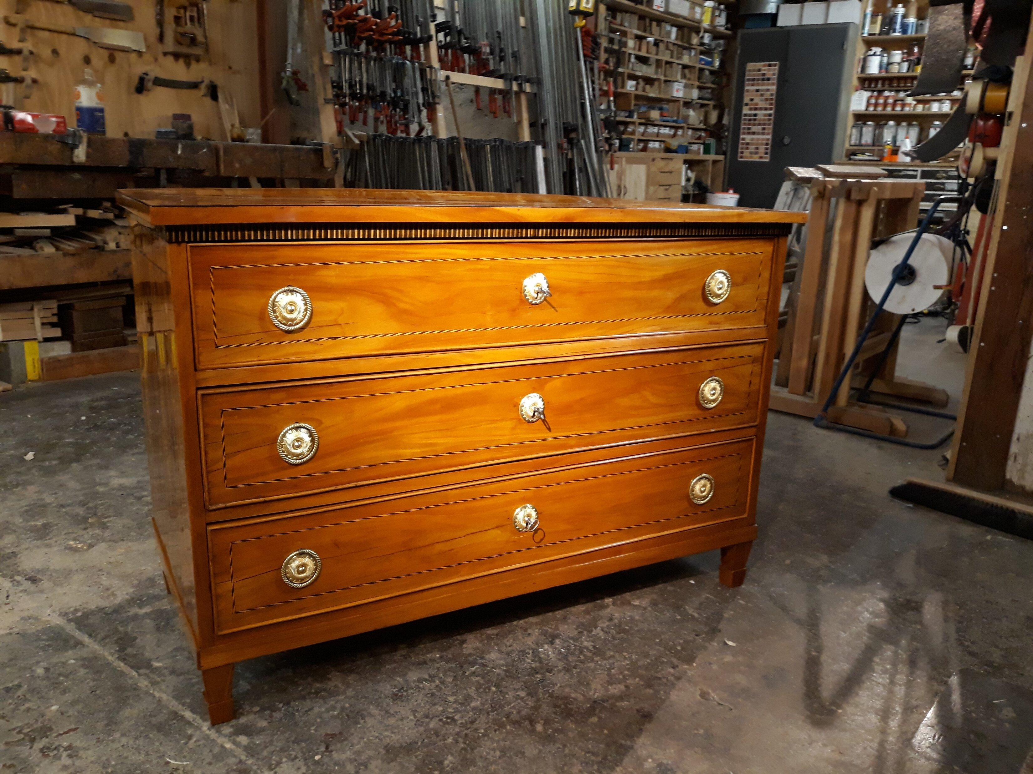 Nicht ohne Stolz möchten wir das Ergebnis unserer Restaurierung im Rahmen der SWR-Dreharbeiten präsentieren. Es ist keine Frage, diese klassizistische Kommode von um 1800 hatte ihre Tücken, aber zu sehen, was aus dem einen oder anderen anmutenden „hoffnungslosen Fall" mit Geduld und Arbeit herauszuholen ist, begeistert auch uns immer wieder!